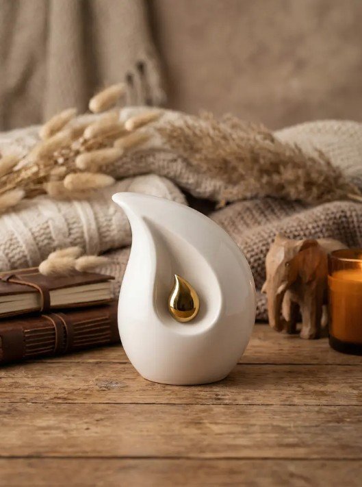 Réalisée en céramique aux lignes douces, cette urne adopte une forme de goutte, symbole d’émotion, de vie et de lien profond. En son cœur, un élément doré capte la lumière
