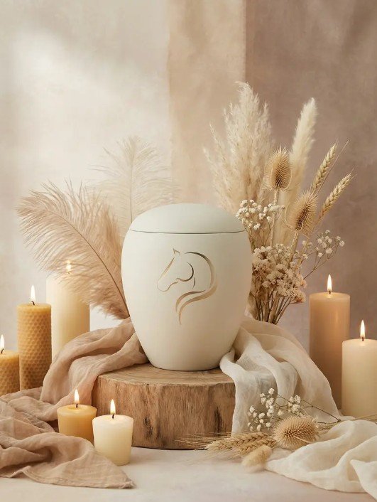 Conçue en céramique de couleur crème, à la surface délicatement veloutée, cette urne offre un écrin élégant et apaisant pour conserver une partie des cendres d’un cheval.
