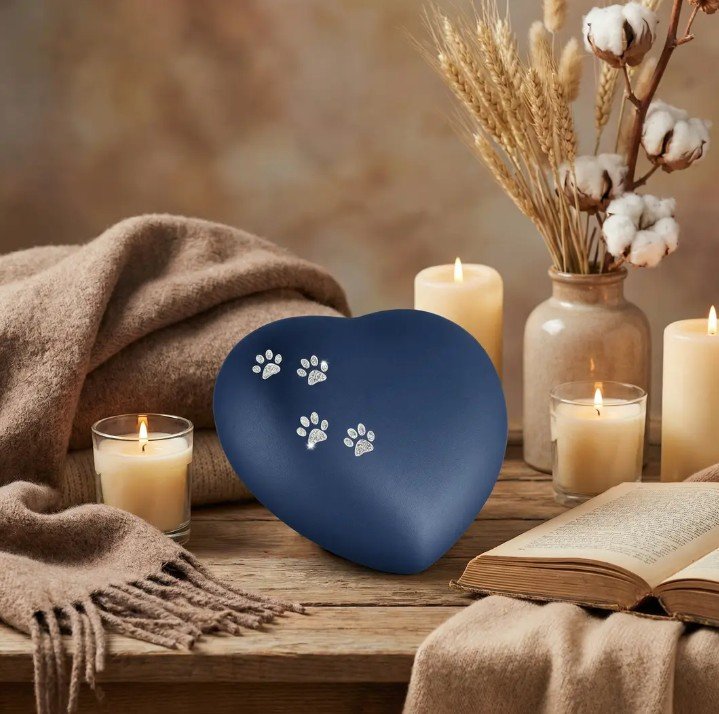Cette urne cœur bleu marine, en céramique mate, est délicatement ornée de petites pattes en brillants, symbole des traces précieuses laissées par votre compagnon.
