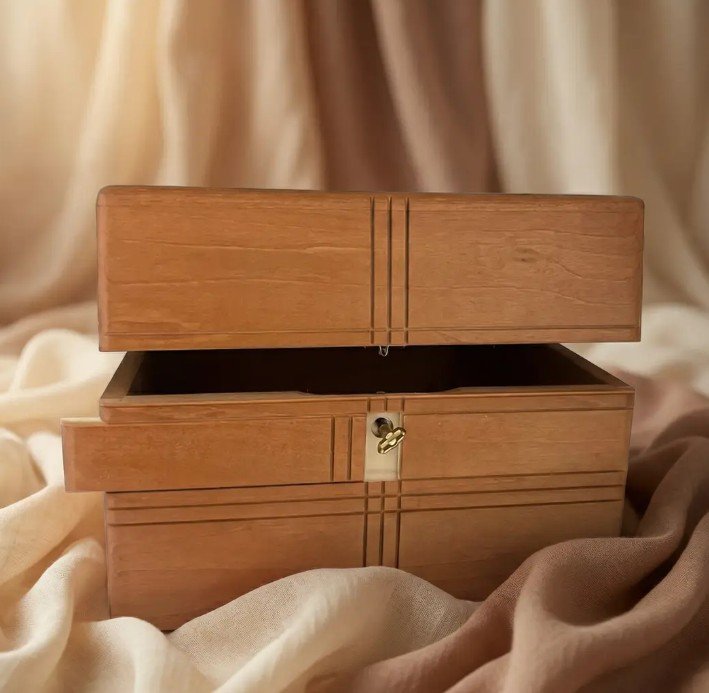Urne coffret en tilleul, finition vernie teintée, élégante et discrète. Son design en coffret, avec une clé cachée, offre une protection délicate et symbolique au souvenir de votre